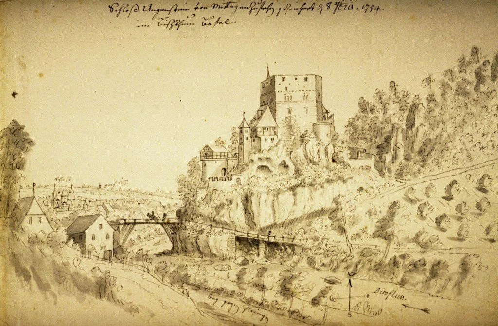 So ist in der Projektion zu sehen, wie Emanuel Büchel (1705–1775) das Schloss Angenstein – der malerischen Wirkung wegen – recht frei in die Landschaft gesetzt hat.
