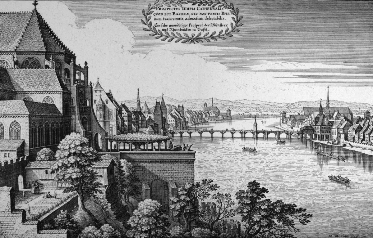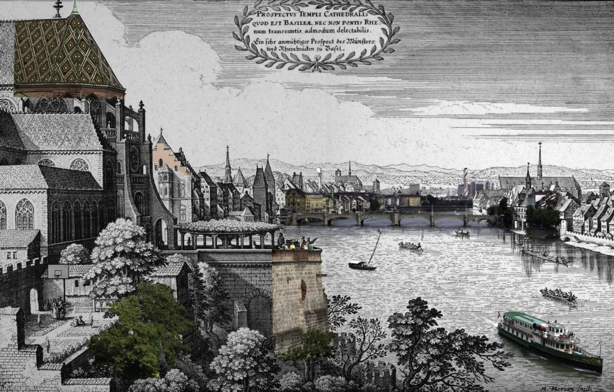 Von Matthäus Merian im Jahre 1642 veröffentlicht, bietet sie eine attraktive Sicht auf Basel mit dem Chor des Münsters im Vordergrund. Das Panorama Basels ist heute noch recht ähnlich, obwohl sich die Skyline gerade hinter der Altstadt oder bei der Mittleren Rheinbrücke verändert hat.